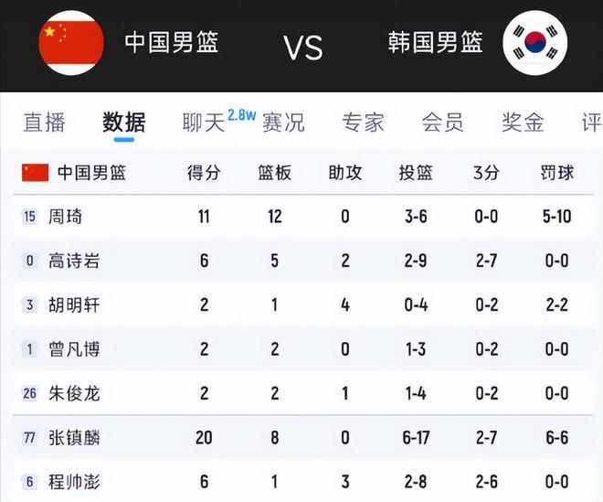 个人数据方面张镇麟20分8板,廖三宁17分,周琦11分12板,胡金秋10分3板,韩国队方面李贤重出战38分钟,0罚球砍下33分6篮板,中国全程未能限制其接球与投篮空间,可以说他一人打败了中国男篮。